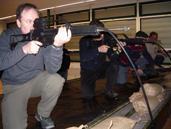 Vereinsmitglieder in der Wilhelm-Frankl Kaserne in Neuburg beim Schießen im Bundeswehr-Schießsimulator für Handwaffen und Panzerabwehr-Handwaffen.